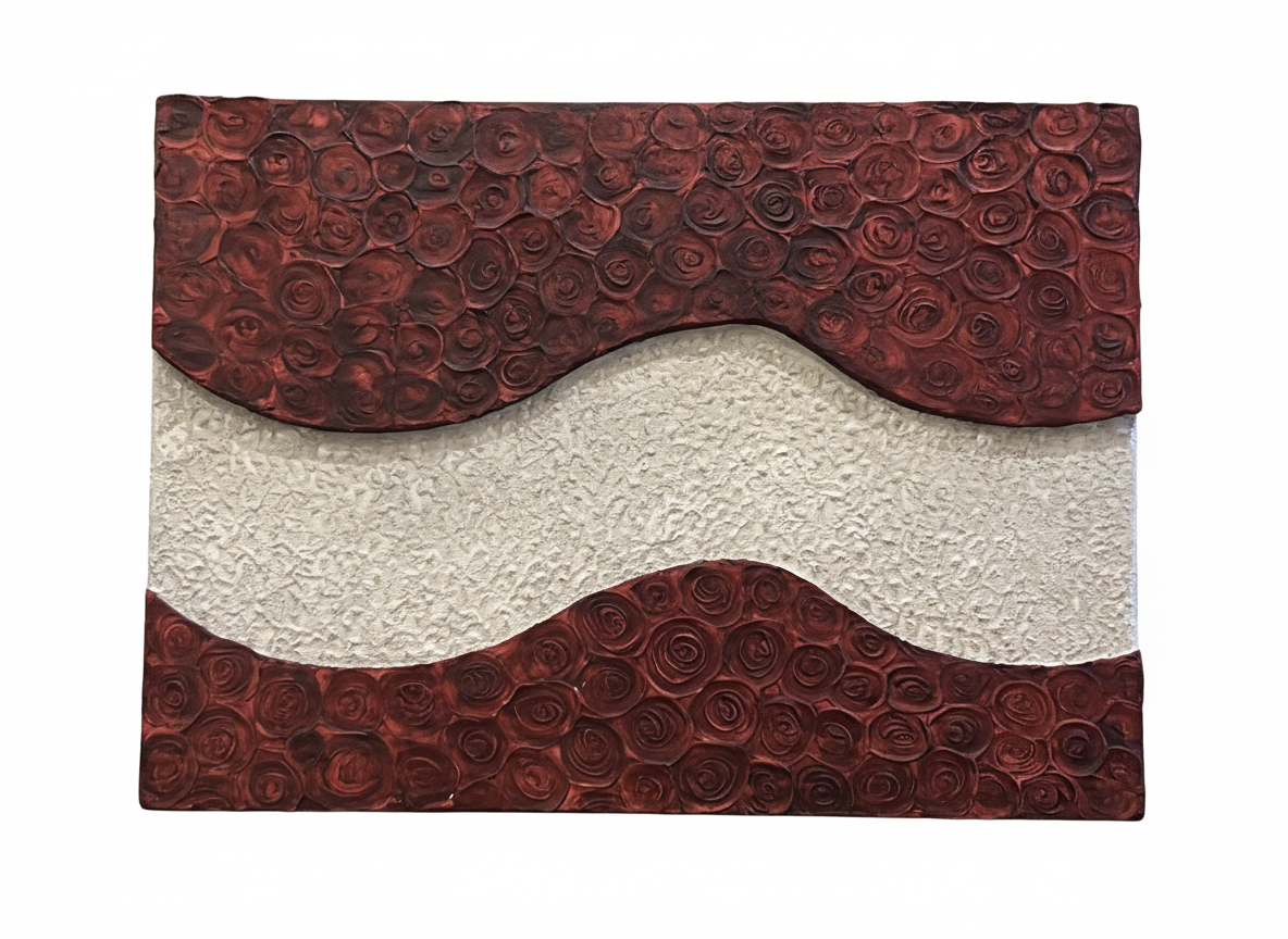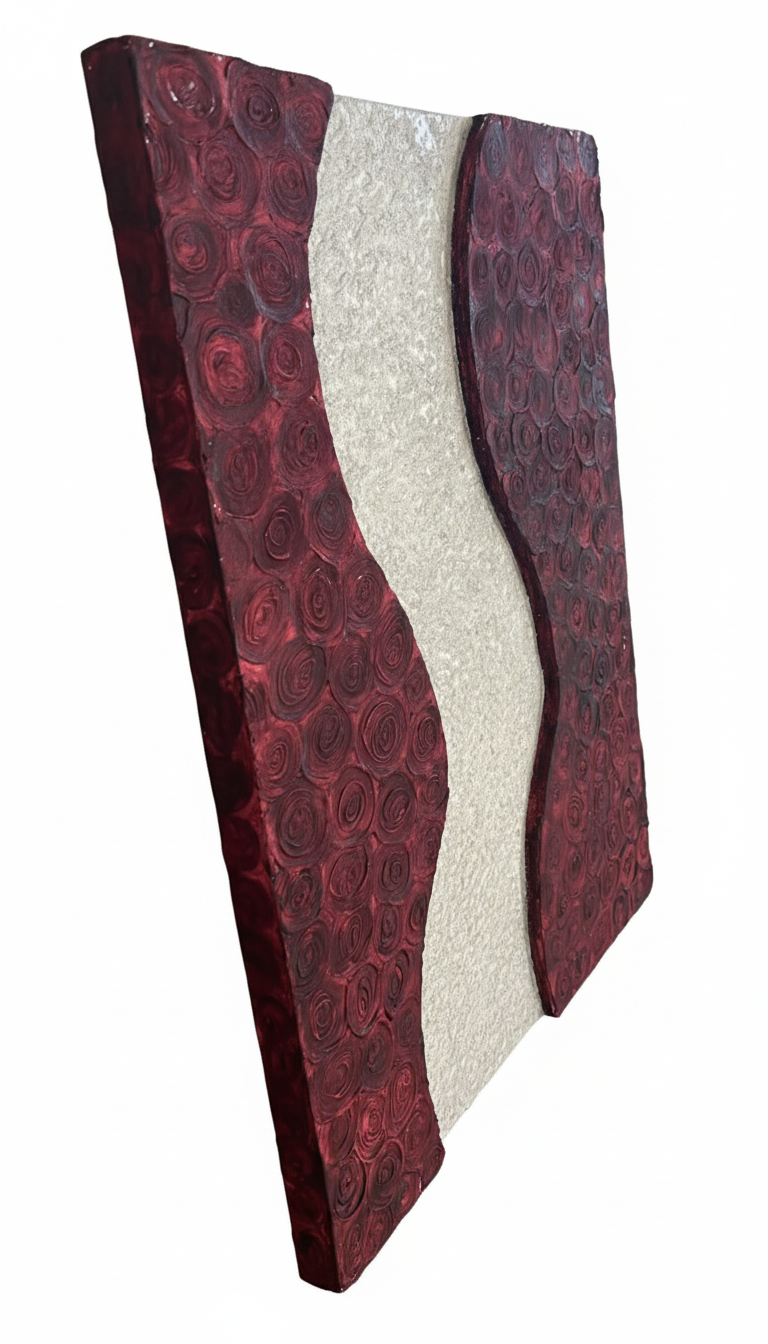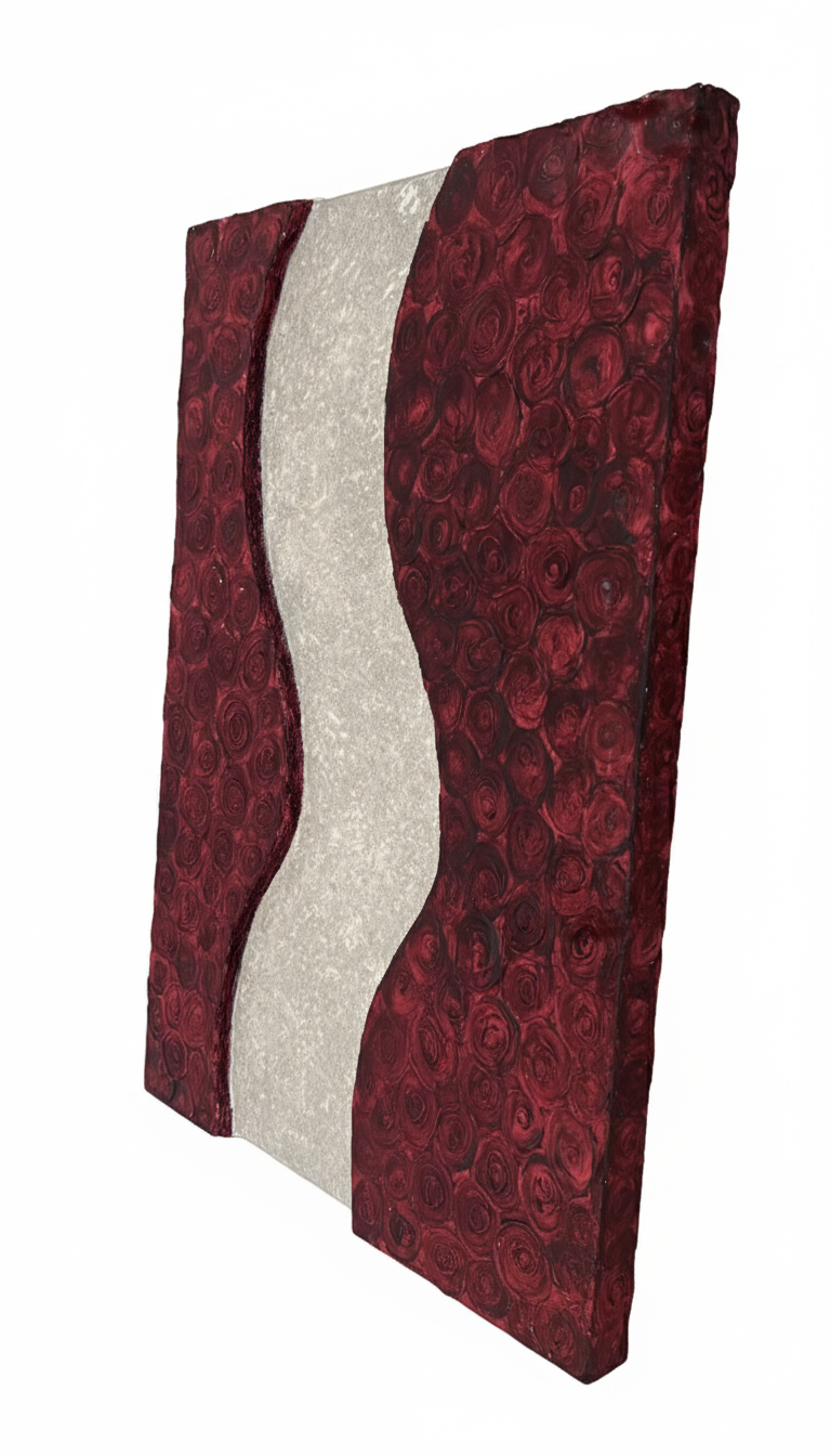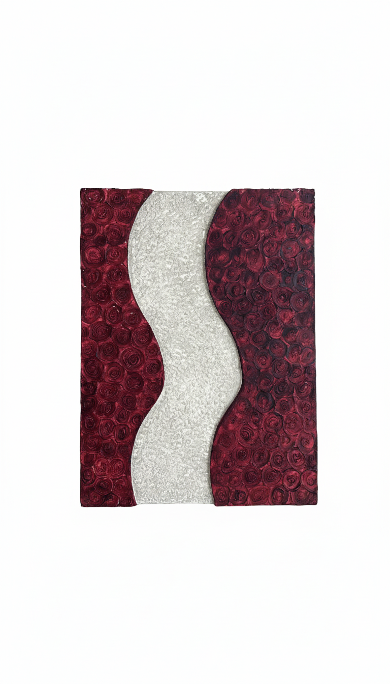 This piece captures the contrast between passion and peace. Deep crimson roses rise in textured waves on either side, while a soft silver path flows calmly through the center. It’s a reflection of duality—of intensity held in balance by stillness. A quiet rhythm between emotion and clarity.