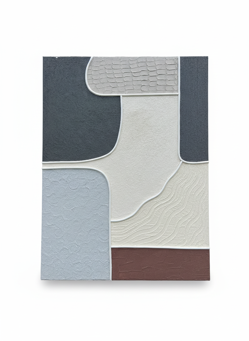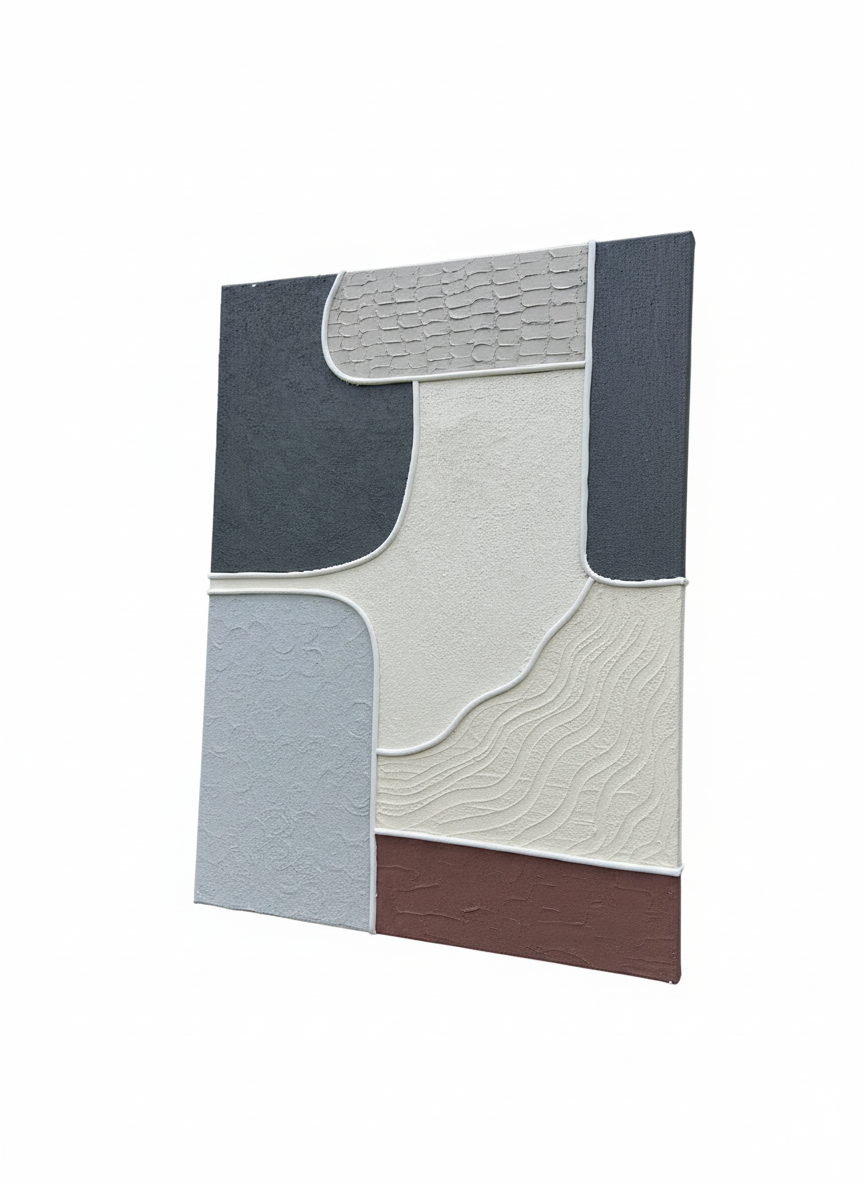 This piece explores how different textures, colors, and shapes can coexist within shared space. Each section holds its own rhythm, yet together they create balance. It’s a reflection on boundaries, not as limits, but as guides that help form connection, contrast, and calm.