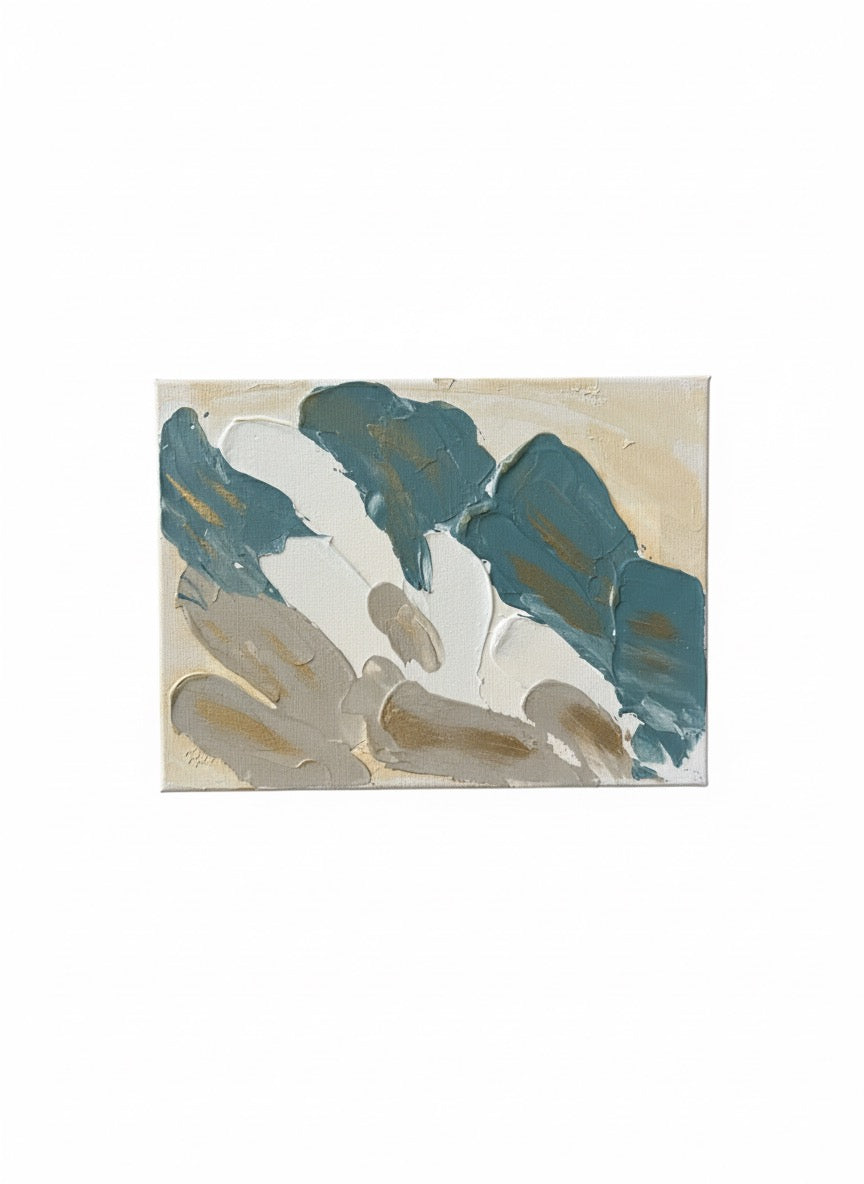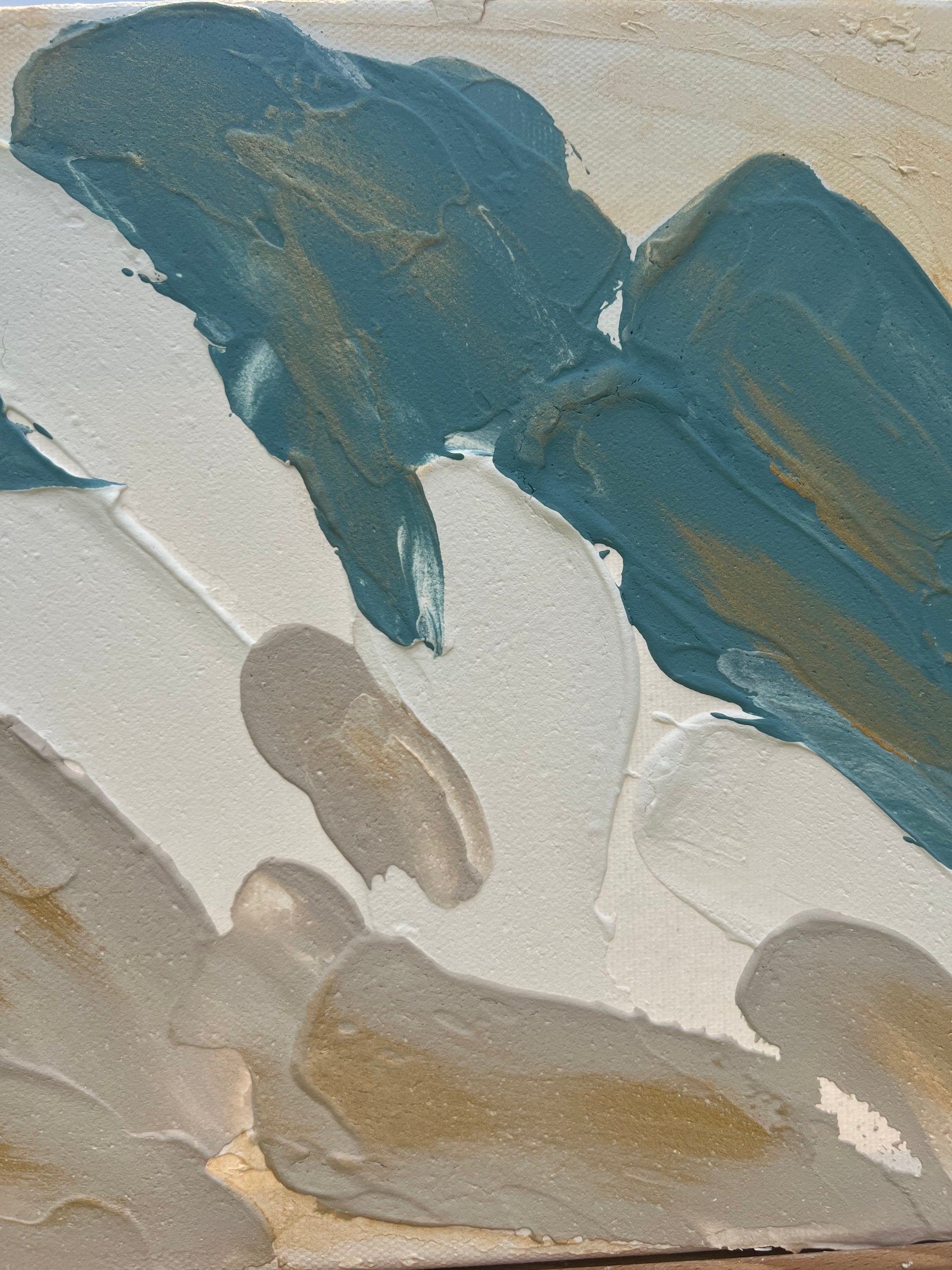 This painting evoke the feeling of a dynamic Texas sky. The sweeping blues represent the vastness of the heavens and the waters of the Gulf, while the creams and gold suggest sunlit clouds, perhaps even the sandy shores. The strokes are fluid and energetic, much like the wind moving across the landscape. It's an exploration of nature's powerful yet serene beauty, capturing a moment of open air and light."