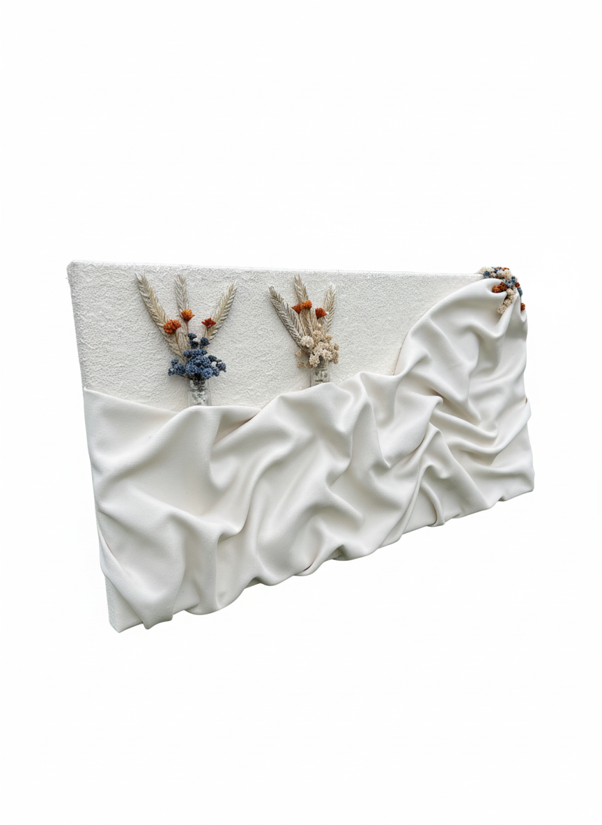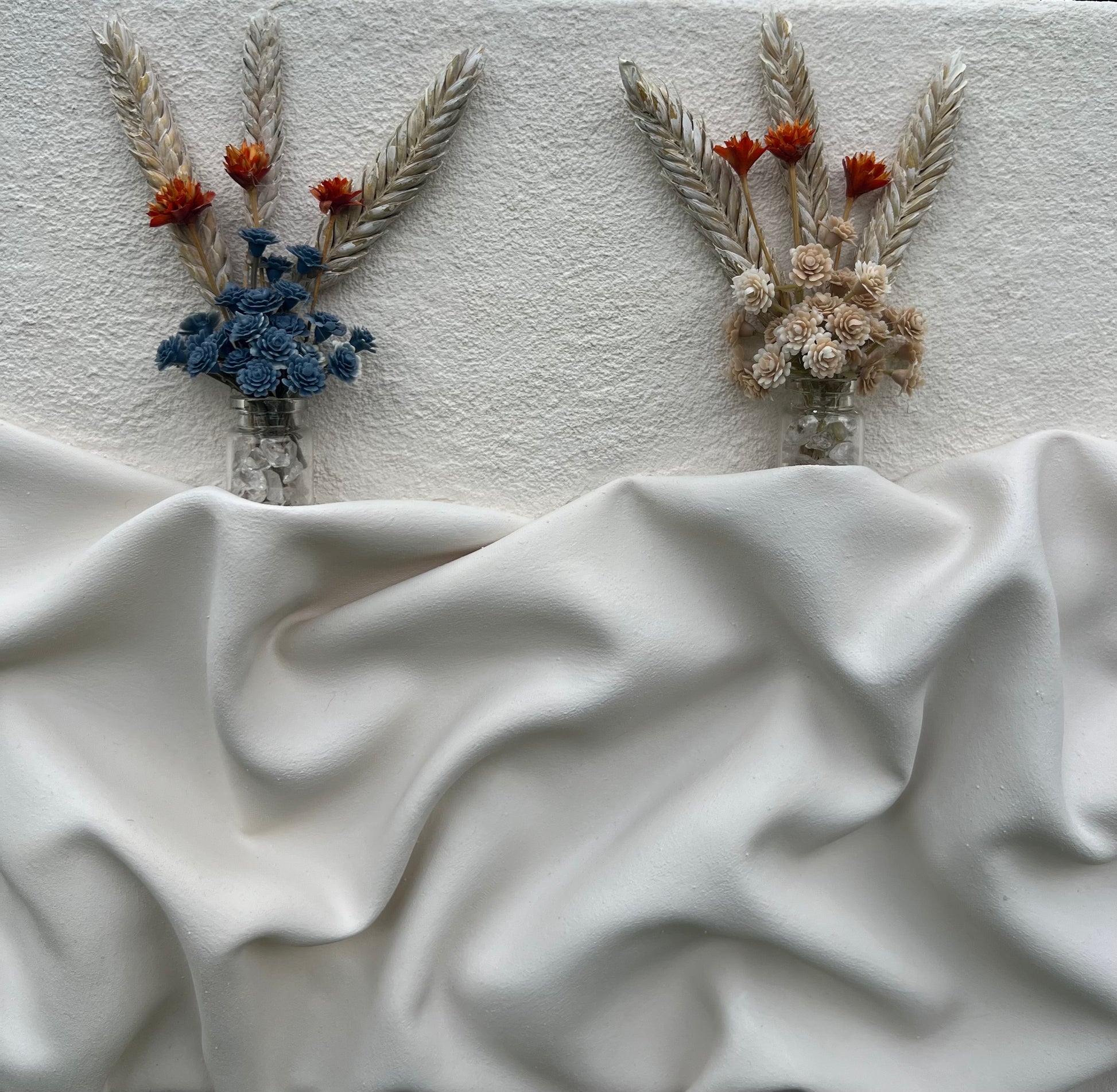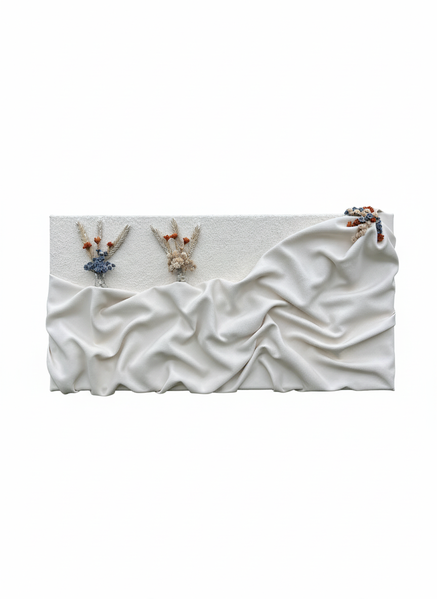 The base is sculpted fabric over canvas, shaped to form soft, rhythmic folds. Decorative figures are made from yarn, twine, and beads, securely attached and arranged to add whimsy and dimension. The entire piece is finished with a matte protective coat for durability.
