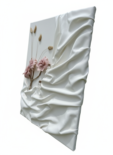 This artwork captures a quiet moment of reflection. With soft folds that cradle blooming florals and glass vials, it evokes the feeling of collecting memories—fragile, tender, and beautifully preserved. Each element holds its place like a thought held gently in time.
