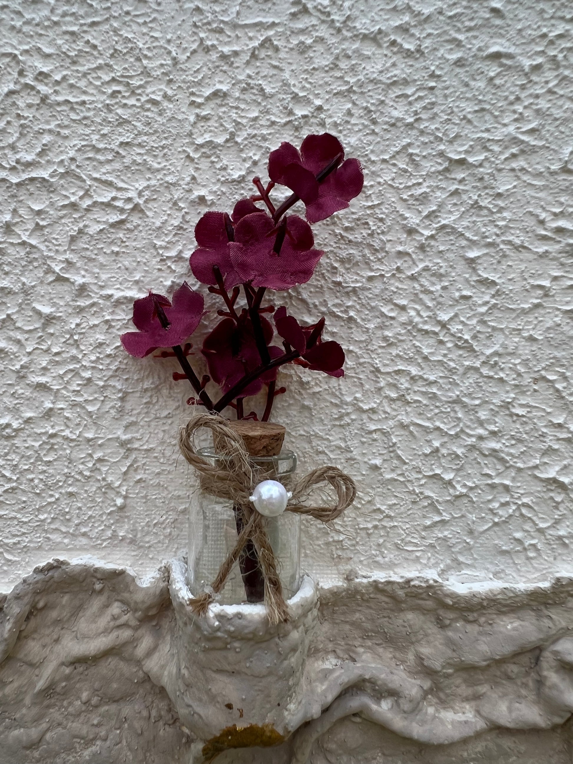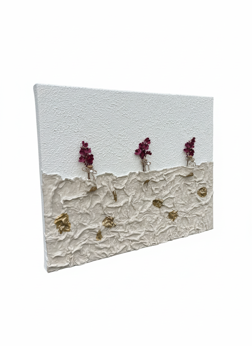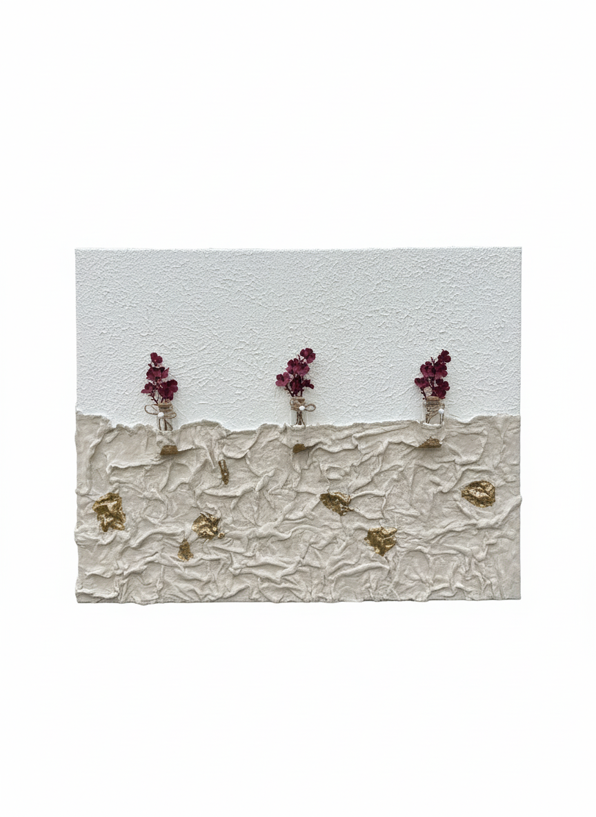 Hand-textured plaster and fabric form the base over canvas, sculpted to evoke natural movement and depth. The top half is left lightly textured for contrast, while the lower half features earth-toned folds adorned with metallic gold accents. Faux flowers are arranged in miniature glass vials, secured in the folds with jute twine and pearl details. The piece is sealed with a matte finish to protect its details and preserve its organic character.