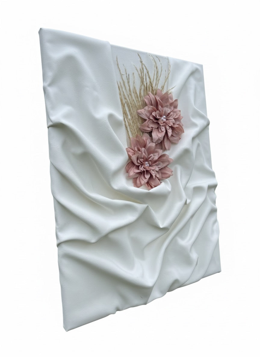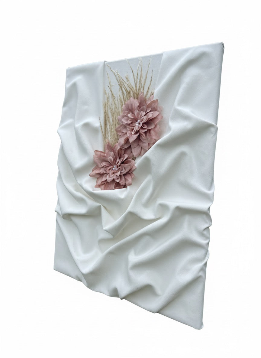 Fabric draped and sculpted over canvas, detailed with artificial flowers and textured faux grass. Acrylic paint is layered selectively over the fabric to enhance movement and dimension, finished with a protective matte seal.