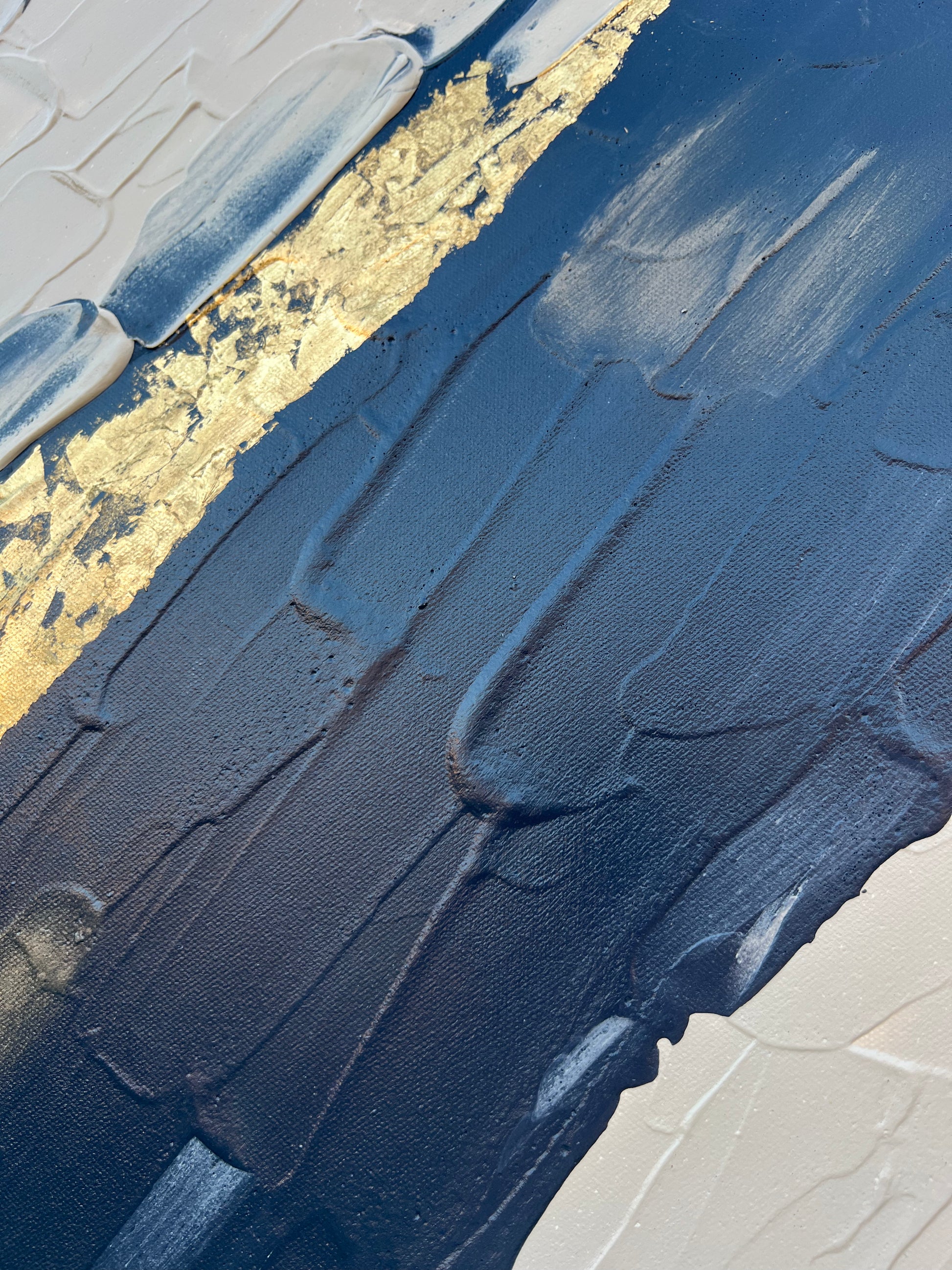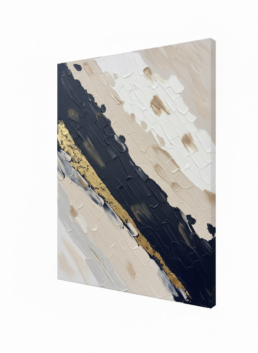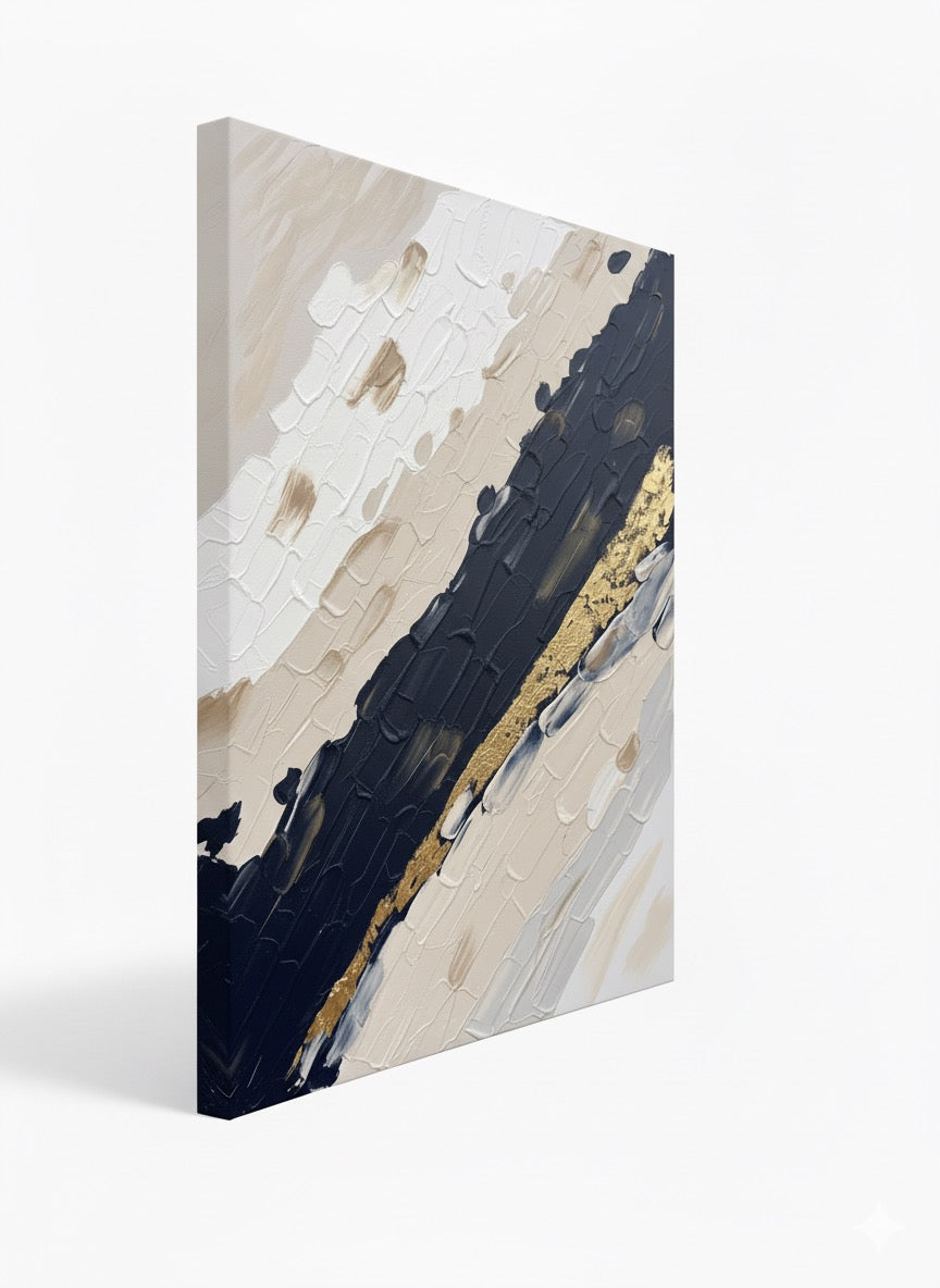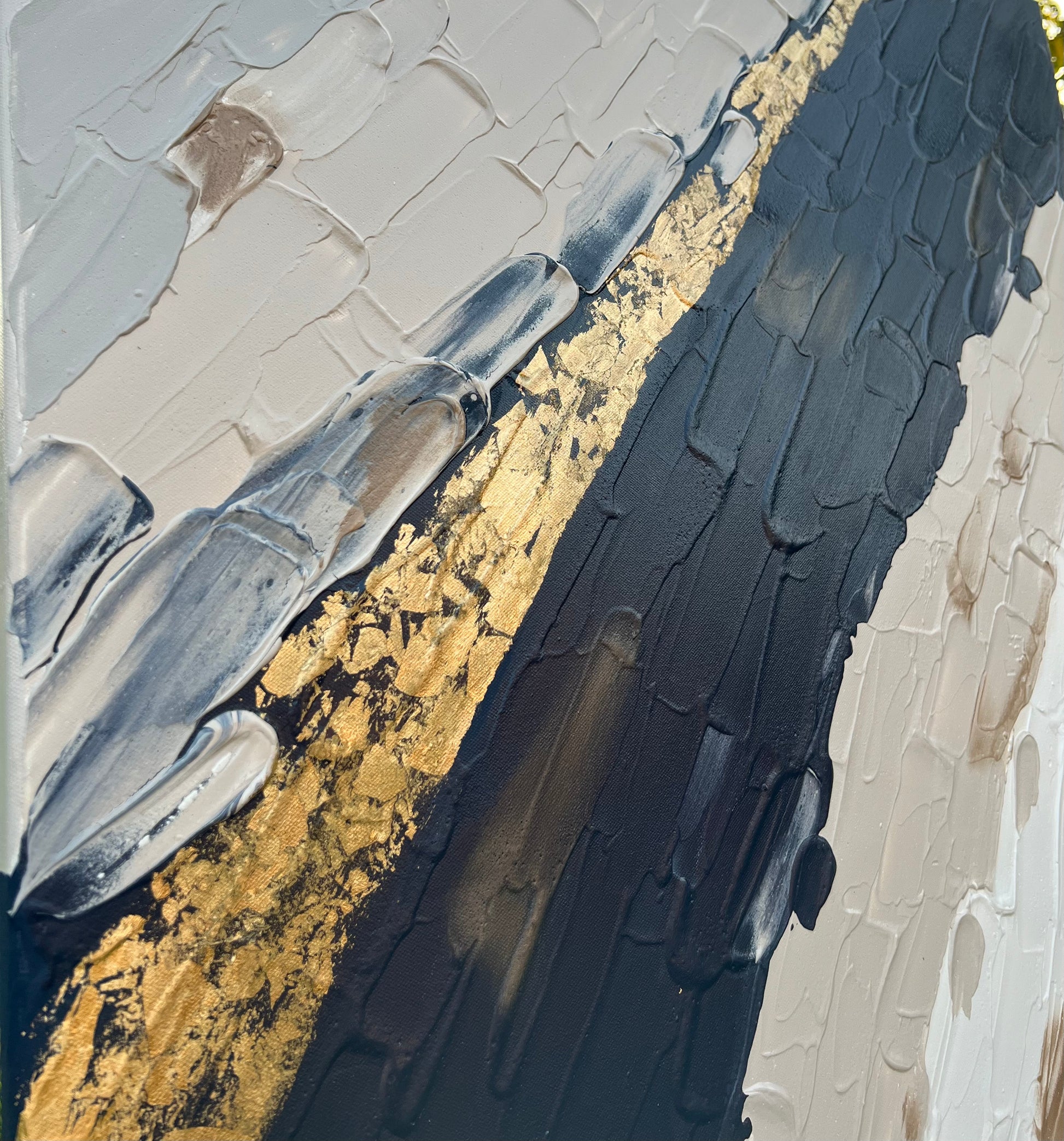 I was inspired by the feeling of life moving forward. The colors and lines represent the different feelings we experience, some dark and some light. The gold line is a reminder that even when things are challenging, there is always a path of hope and light. The painting is about finding your own flow in life, embracing all the emotions, and continuing to move forward.